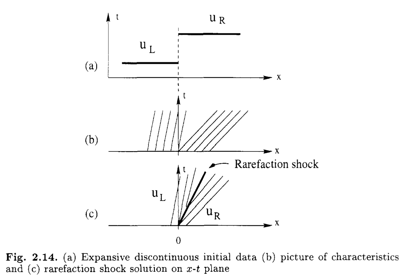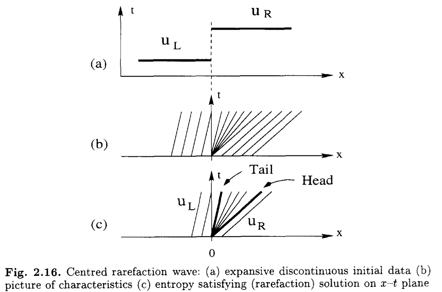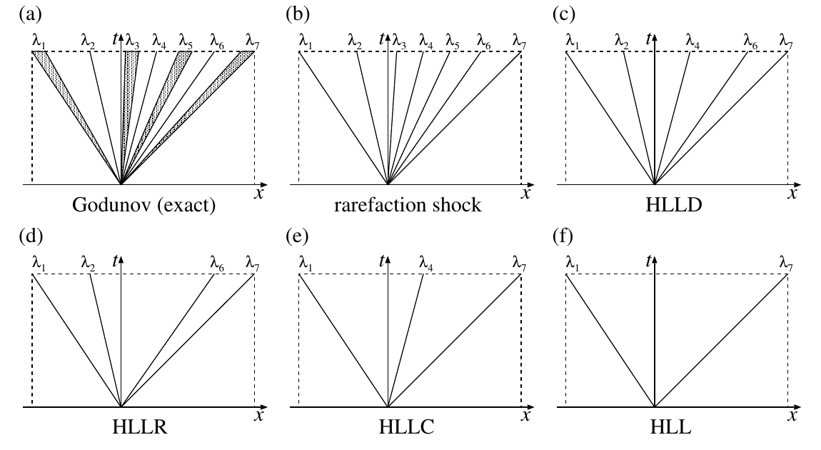 一般に保存則 \[ \frac{\partial \bm{u}}{\partial t} + \frac{\partial \bm{f}(\bm{u})}{\partial x} = 0 \] において初期条件 \[ \bm{u}(x, t=0) = \begin{cases} \bm{u}_{L} \quad x < 0 \\ \bm{u}_{R} \quad x > 0 \end{cases} \] が与えられたときの時間発展を求める問題をRiemann問題と呼ぶ.このとき固有値の数(すなわち変数の数)の分だけ\(x = 0\)から「波」が発生する.この「波」の影響がおよぶ領域をRiemann fanと呼ぶ.