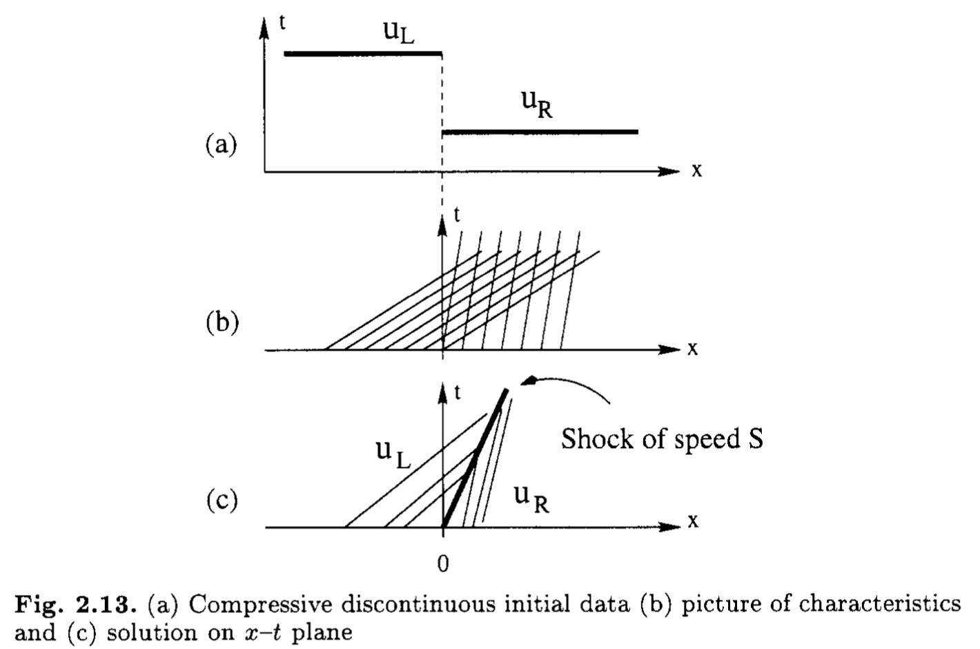 詳細な議論は適当な教科書に譲るとして,直感的には不連続な弱解があるとき, 特性線が不連続に収束する (不連続から特性線が湧き出さない)ことをエントロピー条件として考えればよい.Burgers方程式やEuler方程式を始めとするconvexな流束関数(\(f'(u) > 0\))について考えると,これは以下のように表すことができる. \[ f'(u_{R}) \leq S \leq f'(u_{L}) \] 具体的にBurgers方程式の場合には \[ u_{R} \leq S \leq u_{L} \] がエントロピー条件となる.膨張衝撃波はこれを満たさないことは明らかである.
