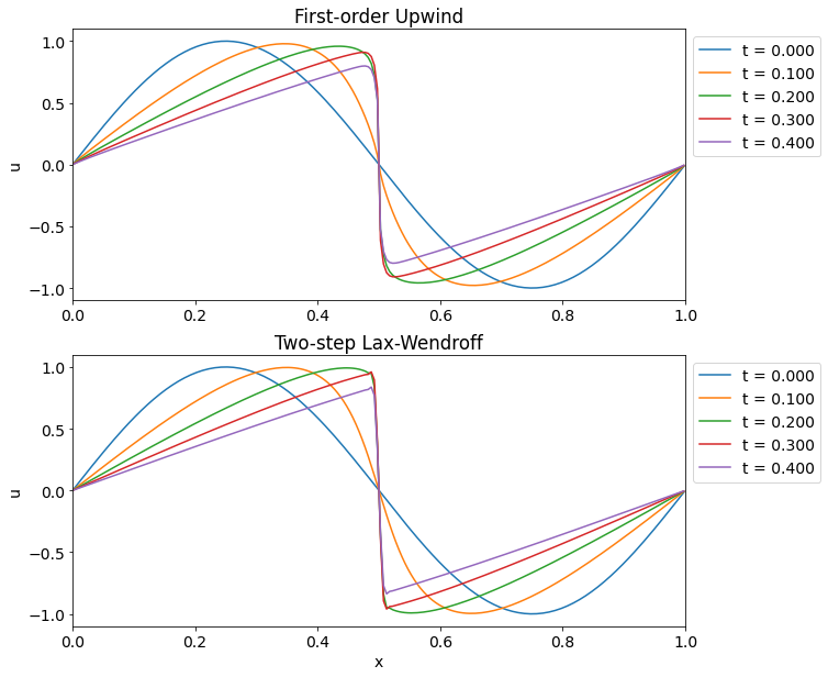 Lax-Wendroffスキームは基礎方程式を使ってTaylor展開の時間微分を空間微分に置き換えるスキームであったが,これは一般の方程式の扱いには不便なのでもう少し扱いやすくしたい.一般の保存形数値解法 \[ \begin{aligned} \frac{\bar{\bm{u}}^{n+1}_{i} - \bar{\bm{u}}^{n}_{i}}{\Delta t} + \frac{\hat{\bm{f}}_{i+1/2} - \hat{\bm{f}}_{i-1/2}}{\Delta x} = 0 \end{aligned} \] において \[ \begin{aligned} & \bm{u}^{n+1/2}_{i+1/2} = \frac{1}{2} \left( u^{n}_{i} + u^{n}_{i+1} \right) - \frac{\Delta t}{2 \Delta x} \left( f(\bm{u}^{n}_{i+1}) - f(\bm{u}^{n}_{i}) \right) \\ & \hat{\bm{f}}_{i+1/2} = \frac{1}{\Delta t} \int_{t^{n}}^{t^{n+1}} \bm{f}(\bm{u}(x_{i+1/2}, t)) dt \approx \hat{\bm{f}}(\bm{u}^{n+1/2}_{i+1/2}) \end{aligned} \] と近似しよう.これを2段階Lax-Wendroffスキームと呼ぶ.このスキームであれば方程式の具体的な形に依存せず適用することが可能である.粘性あり(\(\alpha \neq 0\))のBurgers方程式に適用するには \[ \begin{aligned} & u_{i+1/2} = \frac{u_{i} + u_{i+1}}{2} - \frac{\Delta t}{2 \Delta x} \left( f_{i+1} - f_{i} \right) \\ & \hat{f}_{i+1/2} = \frac{(u_{i+1/2})^2}{2} - \kappa_{i+1/2} \frac{\Delta x}{\Delta t} (u_{i+1} - u_{i}) - \alpha \frac{u_{i+1} - u_{i}}{\Delta x} \end{aligned} \] として求めた数値流速を用いればよい.ただし,\(\kappa_{i+1/2} = \varepsilon |u_{i+1} - u_{i}|\)とし,定数\(\varepsilon \sim 0.1\)で人工粘性の強さをコントロールする.