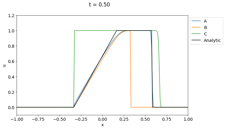 簡単のため\(u > 0\)および\(\alpha = 0\)を仮定しよう.このとき風上差分でも以下の3通りが考えられる. \[ \begin{align} \frac{u^{n+1}_{i} - u^{n}_{i}}{\Delta t} &+ \frac{u^{n}_{i} + u^{n}_{i-1}}{2} \frac{u^{n}_{i} - u^{n}_{i-1}}{\Delta x} = 0 \tag{A} \\ \frac{u^{n+1}_{i} - u^{n}_{i}}{\Delta t} &+ u^{n}_{i} \frac{u^{n}_{i} - u^{n}_{i-1}}{\Delta x} = 0 \tag{B} \\ \frac{u^{n+1}_{i} - u^{n}_{i}}{\Delta t} &+ u^{n}_{i-1} \frac{u^{n}_{i} - u^{n}_{i-1}}{\Delta x} = 0 \tag{C} \\ \end{align} \]