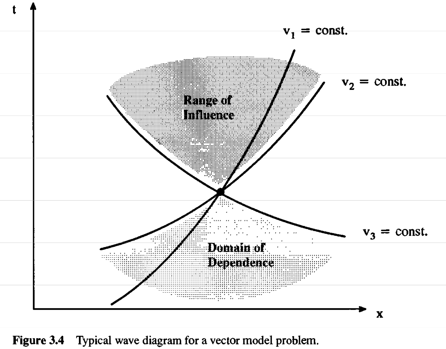 保存則を変形して \[ \begin{aligned} \frac{\partial \bm{u}}{\partial t} + \frac{\partial \bm{f}(\bm{u})}{\partial x} = 0 \rightarrow \frac{\partial \bm{u}}{\partial t} + \frac{\partial \bm{f}}{\partial \bm{u}} \cdot \frac{\partial \bm{u}}{\partial x} = \frac{\partial \bm{u}}{\partial t} + \bm{A} \cdot \frac{\partial \bm{u}}{\partial x} = 0 \end{aligned} \] と書いておこう.ここで\(A_{ij} = \partial f_{i}/\partial u_{j}\)はこの系のJacobianである.このJacobianの固有値\(\lambda_{i}\)および固有ベクトル\(\bm{r}_{i}\)を \[ \bm{A} \bm{r}_{i} = \lambda_{i} \bm{r}_{i} \quad (i=1, 2, \ldots, n) \] によって定義する.固有ベクトルを並べた行列\(\bm{R} = (\bm{r}_1, \bm{r}_2, \ldots, \bm{r}_{n})\)を用いると,Jacobianを対角化できる. \[ \bm{\Lambda} = \bm{R}^{-1} \bm{A} \bm{R} = \text{diag} (\lambda_1, \lambda_2, \ldots, \lambda_n) \] さらに変数変換\(d \bm{v} \equiv \bm{R}^{-1} d \bm{u}\)を用いると,元の方程式は\(n\)個の独立な線形移流方程式 \[ \frac{\partial v_{i}}{\partial t} + \lambda_{i} \frac{\partial v_{i}}{\partial x} = 0 \] に書き直すことができる.ここで固有値\(\lambda_i\)は\(v_i\)の伝播速度(特性速度)を表しており,明らかに\(v_i\)は特性量(Riemann不変量)である.