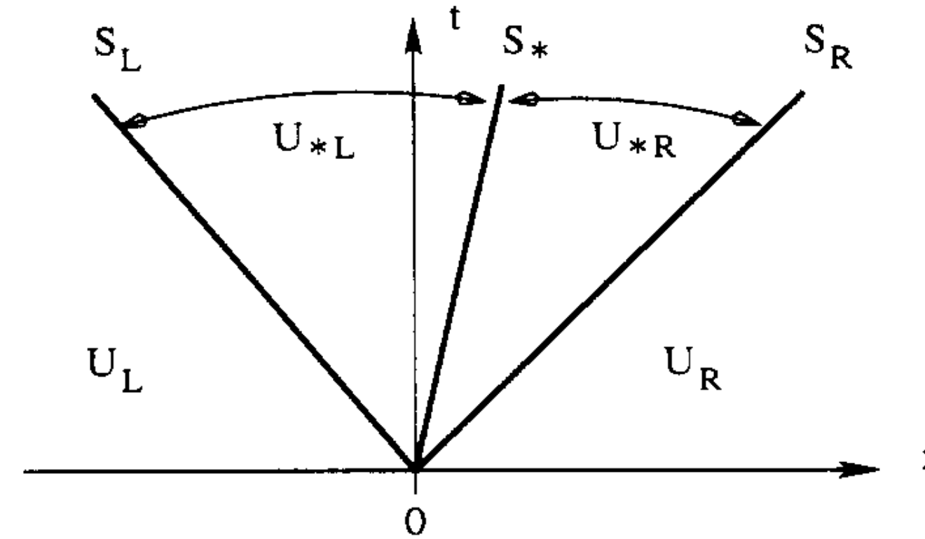 ここまでは一般的に成り立つ議論であったが,Riemann fanの内部状態(\(S_{*}, \bm{u}_{*L}, \bm{u}_{*R}\))を求めるには仮定が必要になる.