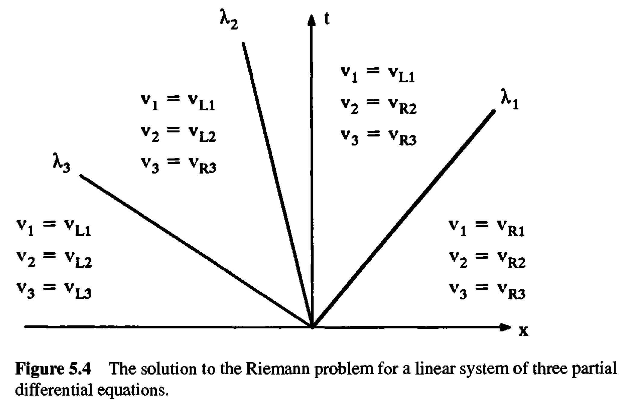 線形Riemann問題ではJacobian\(\bm{A}\)が\(\bm{u}\)に依存しない.したがって,対角化の結果は時間・空間によらず常に同じ結果となる.特性量に書き換えたRiemann問題は \[ \bm{v}(x, t=0) = \begin{cases} \bm{v}_{L} = \bm{R}^{-1} \bm{u}_{L} \quad x < 0 \\ \bm{v}_{R} = \bm{R}^{-1} \bm{u}_{R} \quad x > 0 \end{cases} \] となる.各特性量に関する線形移流方程式は互いに独立なので,線形Riemann問題の解はトリビアルに決まる.例えば独立変数の数が\(n = 3\)のときの解は下図の通り.