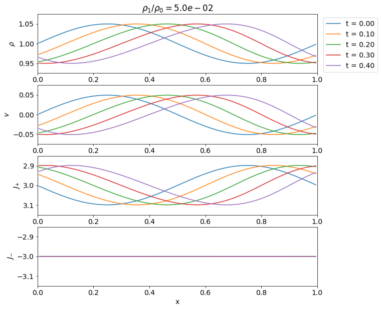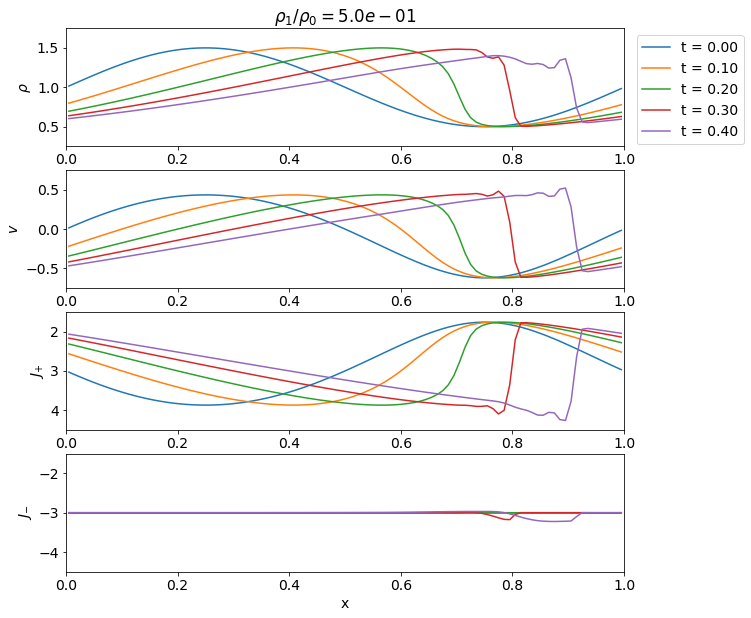 簡単のためエントロピー\(S = p/\rho^\gamma\)が一定と仮定しよう.Euler方程式を書き直すと以下の2式が得られる. \[ \begin{aligned} & \frac{\partial \rho}{\partial t} + \rho \frac{\partial v}{\partial x} + v \frac{\partial \rho}{\partial x} = 0, \\ & \frac{\partial v}{\partial t} + v \frac{\partial v}{\partial x} + \frac{C_s^2}{\rho} \frac{\partial \rho}{\partial x} = 0. \end{aligned} \] ここで\(C_s^2 = \gamma p/\rho \propto \rho^{\gamma-1}\)は定数でないことに注意.さらに\(\rho\)を\(C_s\)で書き換えると \[ %\begin{aligned} \frac{\partial}{\partial t} \left( v \pm \frac{2 C_s}{\gamma-1} \right) + \left( v \pm C_s \right) \frac{\partial}{\partial x} \left( v \pm \frac{2 C_s}{\gamma-1} \right) = 0, \tag{4.2.2} \label{eq:riemann-invariant} %\end{aligned} \] となり,\(J_{\pm} = v \pm 2 C_s/(\gamma-1)\)が以下で定義される特性曲線に沿って一定となる(すなわちRiemann不変量である)ことが分かる. \[ \frac{dx}{dt} = \lambda_{\pm} = v \pm C_s. \]