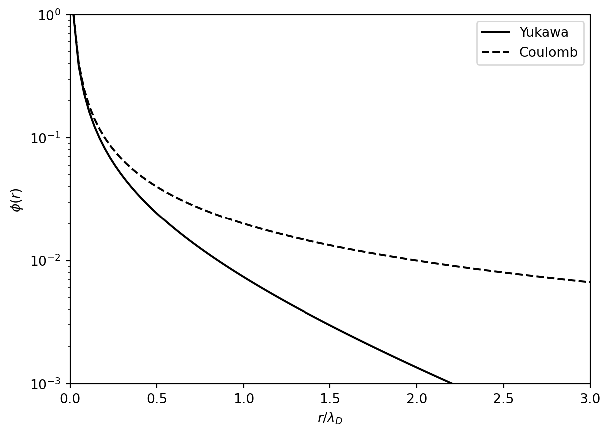 プラズマ中にテスト電荷Q (>0)を置くと,この電荷が作る静電ポテンシャルを打ち消すようにプラズマ中の電子が応答し,静電ポテンシャルはYukawa型のポテンシャル \phi (r) = \frac{1}{4\pi\epsilon_0} \frac{Q}{r} \exp \left( - \frac{r}{\lambda_D} \right) \qquad(1.1) となる.ここで \frac{1}{\lambda_D^2} \equiv \frac{n_0 e^2}{\epsilon_0 k_B T} で定義される \lambda_D をDebye長と呼ぶ.このポテンシャルでは遠方 r \gg \lambda_D ではCoulombポテンシャルよりも急速に減衰する( 図 1.1 参照).これをDebye遮蔽と呼ぶ.