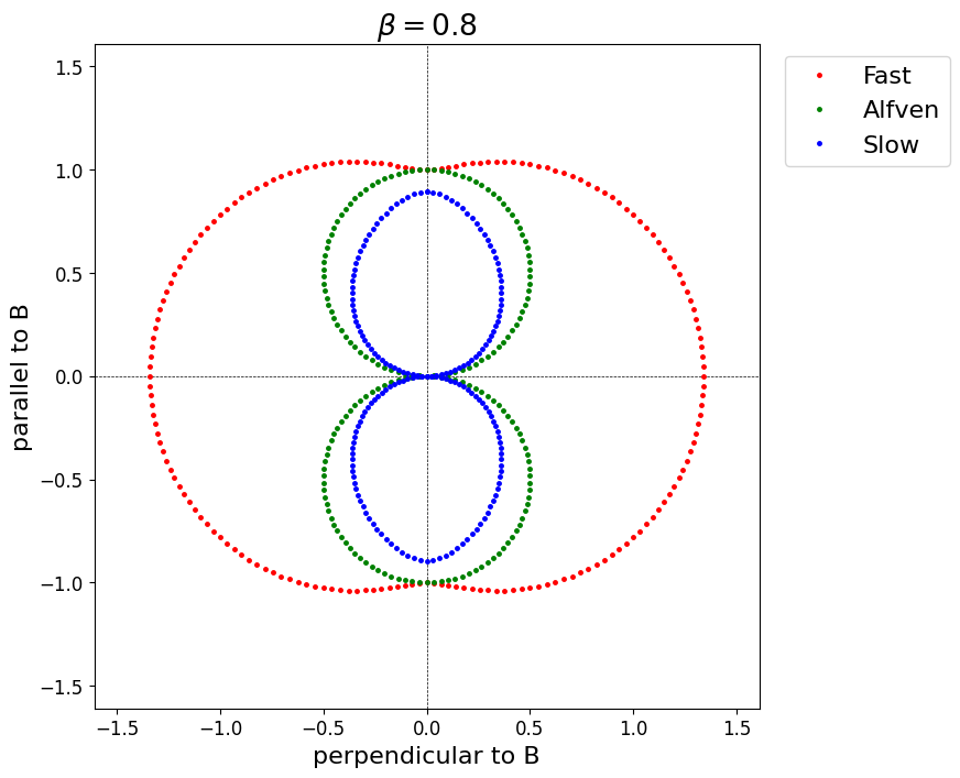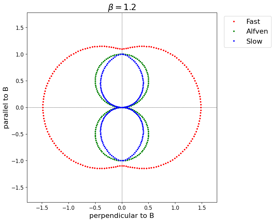 磁気流体波動の異方性を表すために 図 1.2 や 図 1.3 のようなFreidrichsダイアグラムが用いられることがある. これはそれぞれのモードについて,磁場に対する伝播角と位相速度の関係を表したものである.